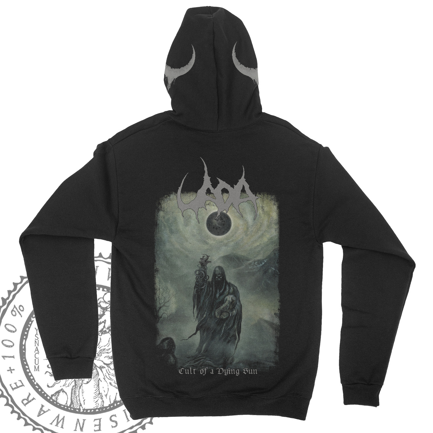 Sigil pocket print in dark grey and 7 colour back print, with a dark grey moon printed on both sides of the hood.