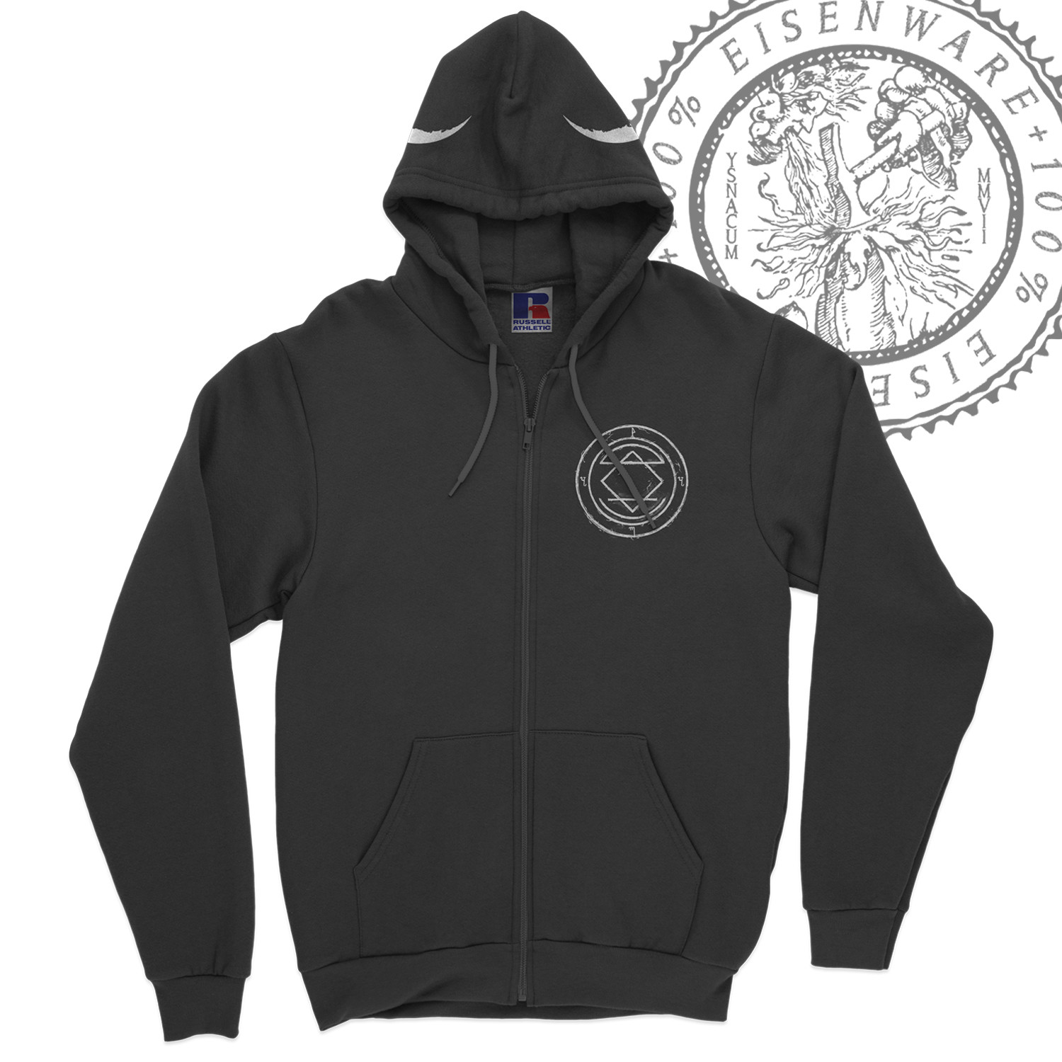 Sigil pocket print in white and multicolored back print, with a white moon printed on both sides of the hood.