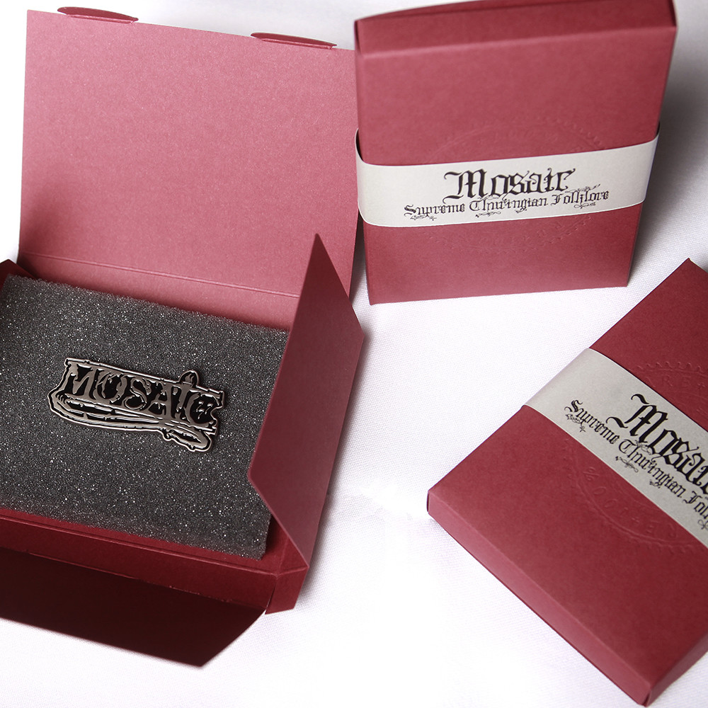 The Eisenware Pin series, Part I. Each of these pins comes packaged in a deluxe natural cardboard fold-out box, featuring embossed merch sigil with band related obi strip and arrives hand-numbered.