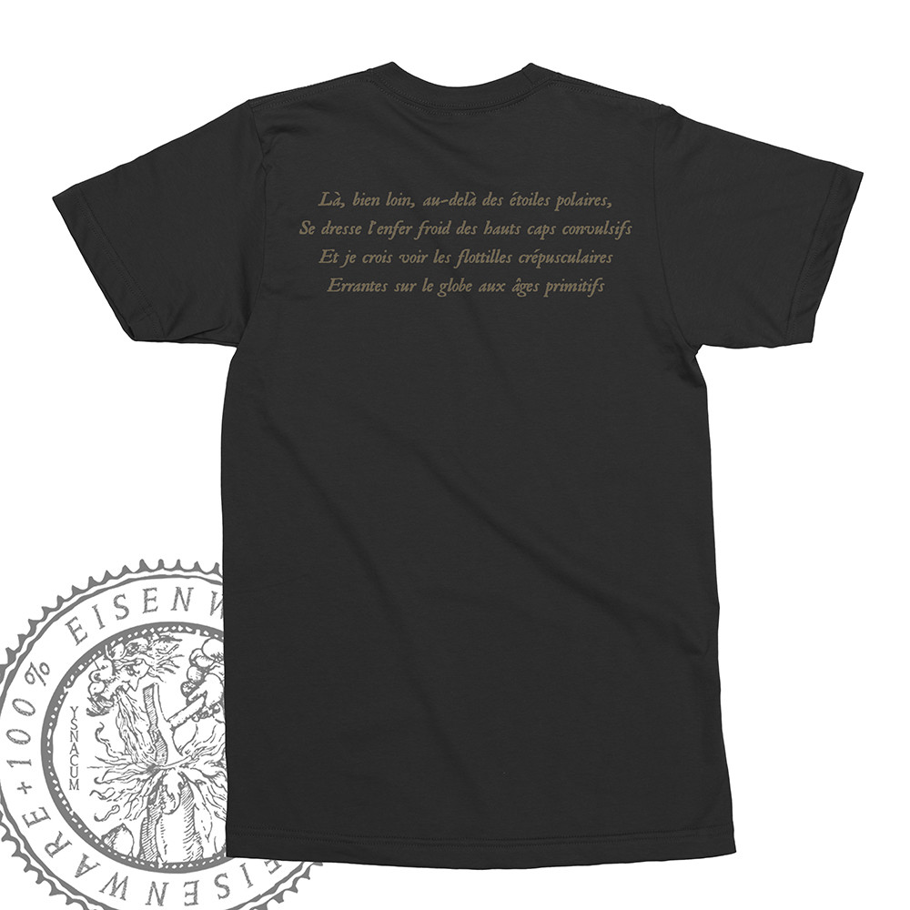 Exclusive shirt design of Cantique Lépreux, released in conjunction with their 2nd album. Black shirts with black, white, grey prints and golden lettering and ornaments!