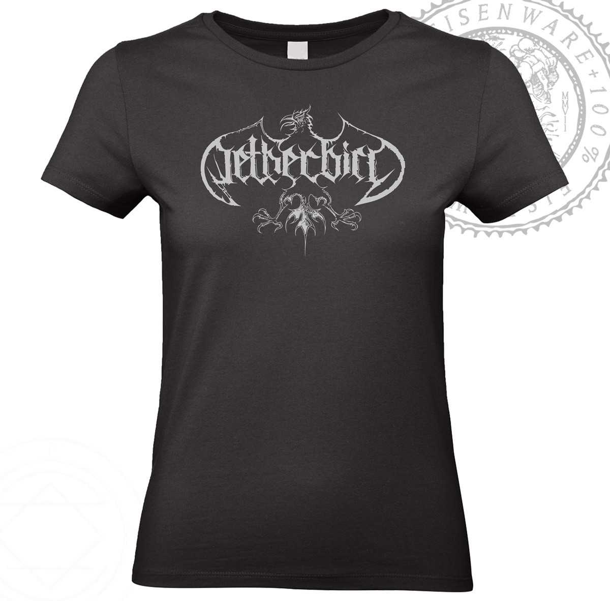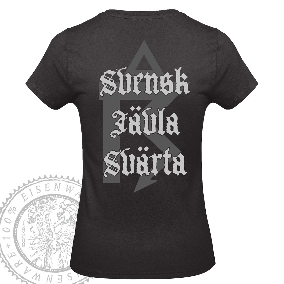 Netherbird logo on front (gray print), "Svensk Jävla Svärta" (Swedish fucking darkness) on the back with the symbol for thunder (both in gray print). Ladies shirt with adjusted prints, to fit the size accordingly.