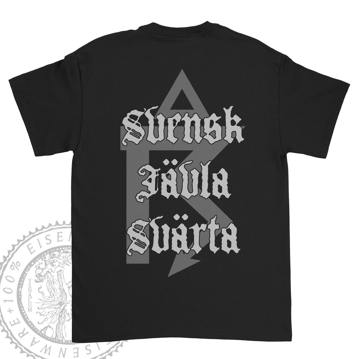 Netherbird logo on front (gray print), "Svensk Jävla Svärta" (Swedish fucking darkness) on the back with the symbol for thunder (both in gray print).