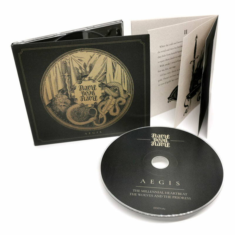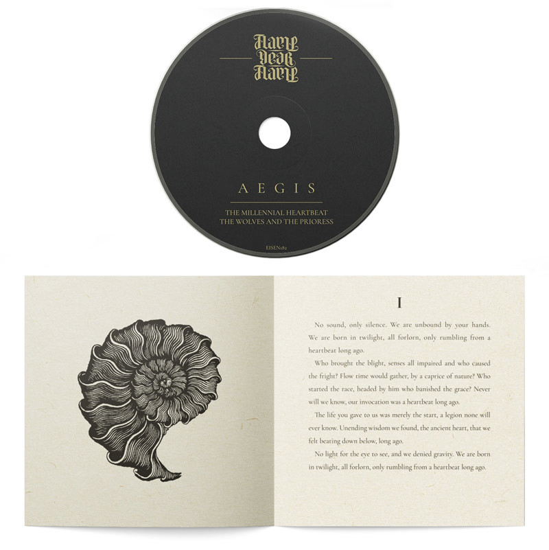 "Aegis" is a work thematically divided into two parts. The first part, entitled "The Millennial Heartbeat", details the genesis of the ocean and the thanatography of the land, a testimony of the forces of nature and its frailty alike, performed in three movements and featuring a classical epic doom approach, rife with gargantuan riffs and percussion as well as soaring clean vocals, yet interspersed with thoughtfully placed and paced clean sections. Serving as a contrasting and complementary second part of the album, "The Wolves and the Prioress" consists of four movements focusing more on acoustic folk elements, further enriching FLAME, DEAR FLAME's engrossing sound, and details the story of a feral child that falls into the custody of a sage prioress.