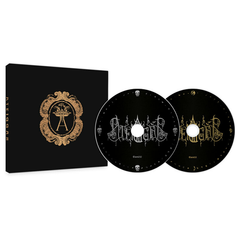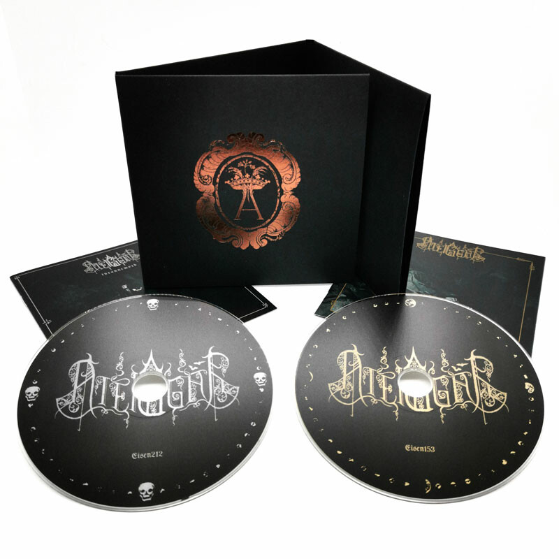 6-panel digisleeve on special black, rough card stock, copper hotfoil embossing, incl. 2 booklets with lyrics & illustrations, plus 2 designed download cards for the album and ep.